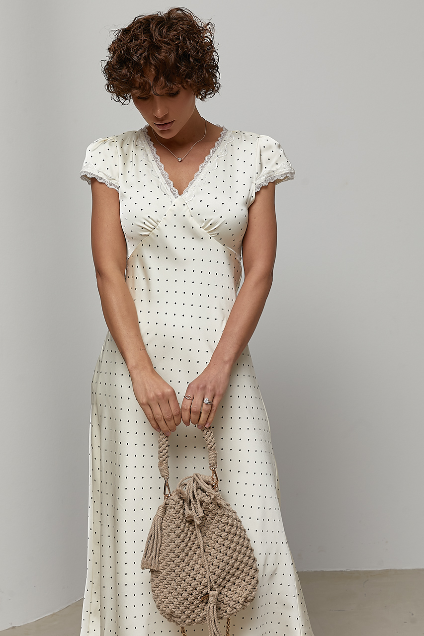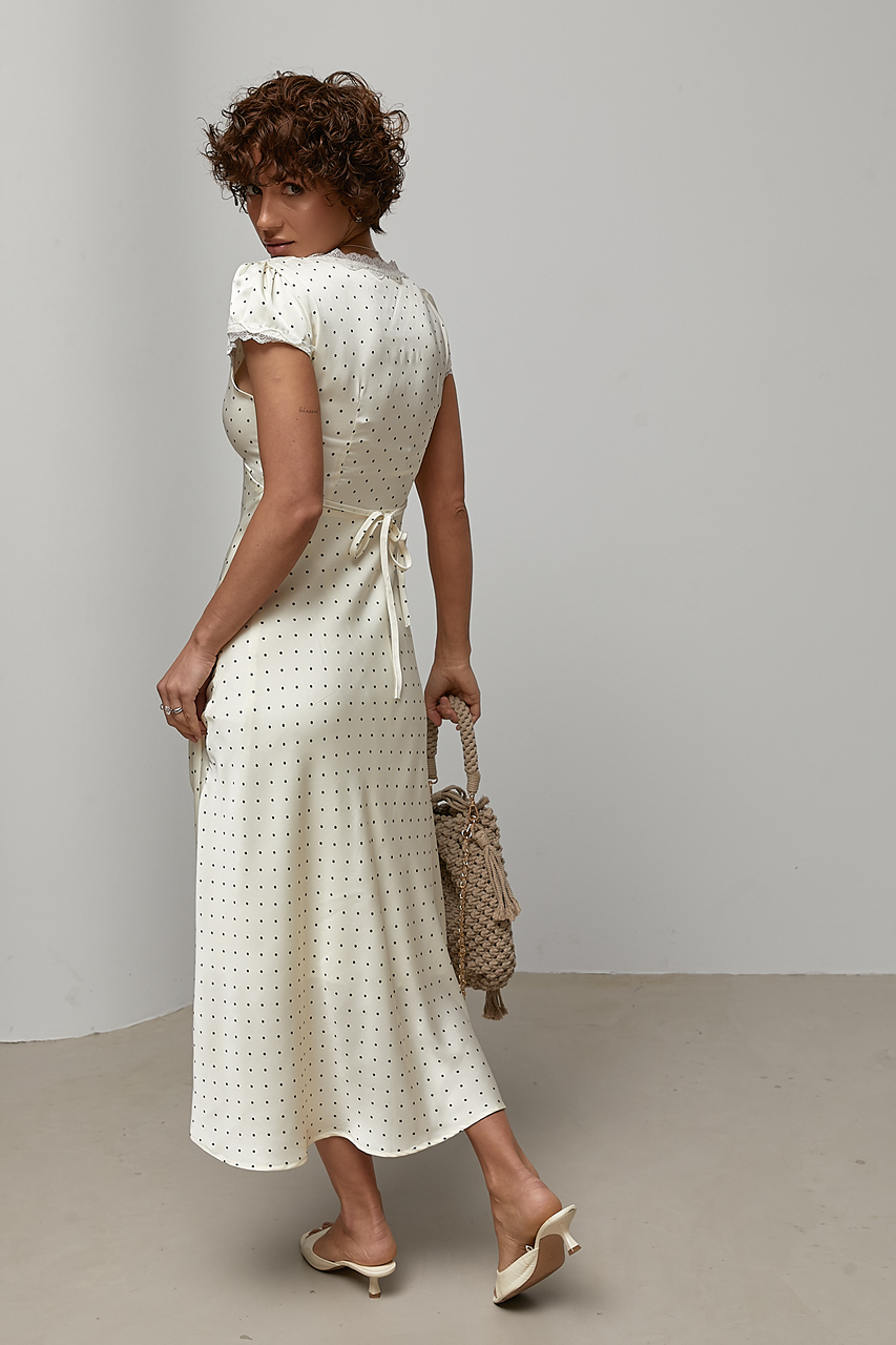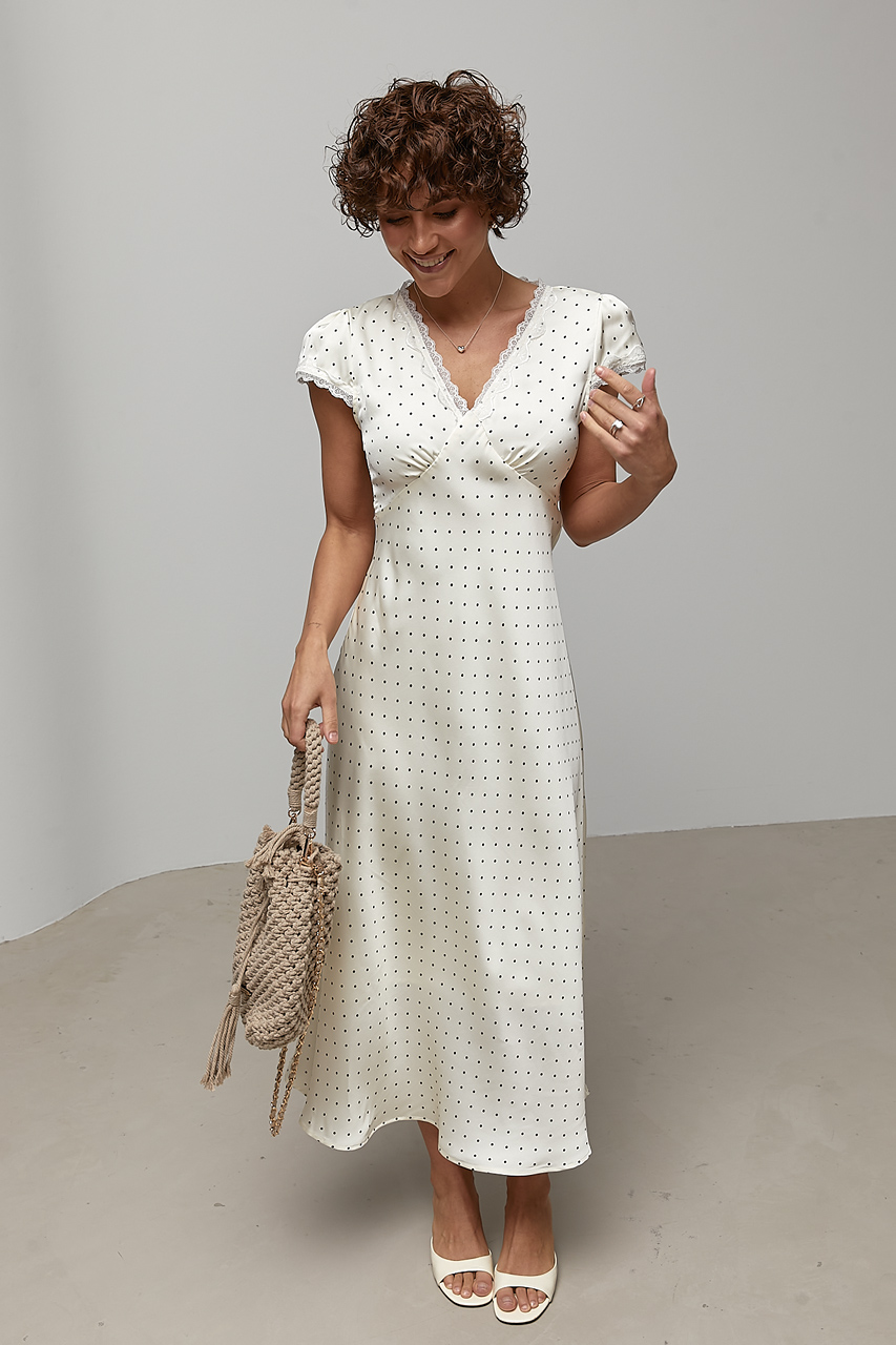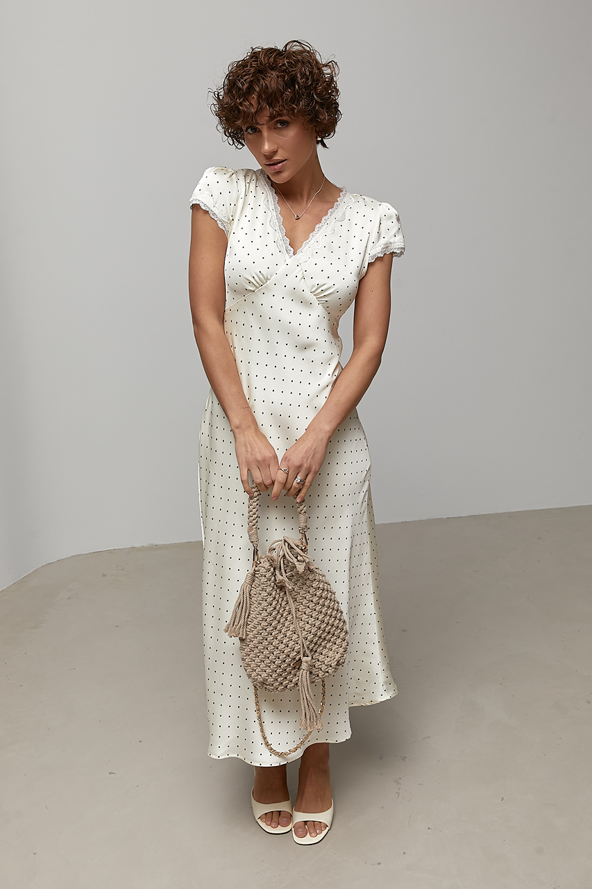 Доступные размеры :[M] Размер M:Ширина під проймами рукавів (над грудьми), см: 44смДовжина рукава від горловини, см: 19смШирина по стегнам: 54смШирина по талії/поясу, см: 42смДовжина виробу, см: 128смАтласна сукня в горох із мереживними вставками — ц.. Читать полностью