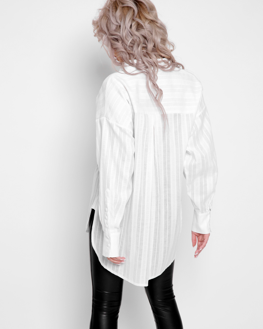 Рубашка из плотного материала. Свободный фасон oversize и удлиненная спинка. Большие карманы. Удобная застежка на пуговицах. Хороший вариант на встречу, праздничное событие или прямо в офис.