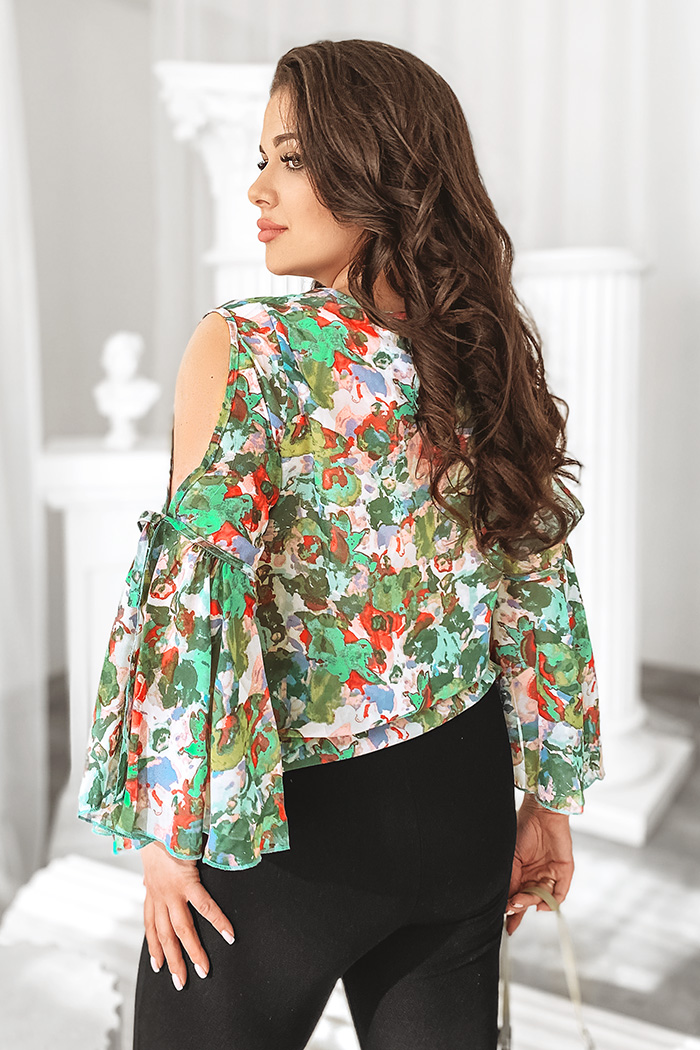 Доступные размеры :[52, 54, 56, 58] Блуза из шифона в разноцветный цветочек с воланами по низу рукавов и слёзками с завязками на рукавах и по горловине. Низ на резинкеПроизводство: УкраинаСезон: летоТкань: шифон. принтСостав: Полиэфир – 100%Размер: 5.. Читать полностью