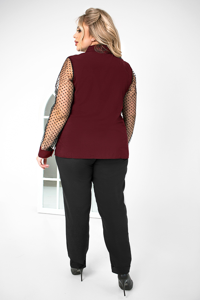 Доступные размеры :[46, 52] Блуза из вискозного шелка с рукавами из прозрачной ткани «сетка флок». Воротник отложной со стойкой. Застёжка – планки на пуговичках. Можно прикрепить бант на стойку. Рукав длинный с манжетойПроизводство: УкраинаСезон: вес.. Читать полностью