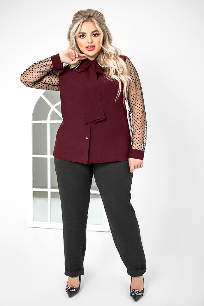 Доступные размеры :[46, 52] Блуза из вискозного шелка с рукавами из прозрачной ткани «сетка флок». Воротник отложной со стойкой. Застёжка – планки на пуговичках. Можно прикрепить бант на стойку. Рукав длинный с манжетойПроизводство: УкраинаСезон: вес.. Читать полностью