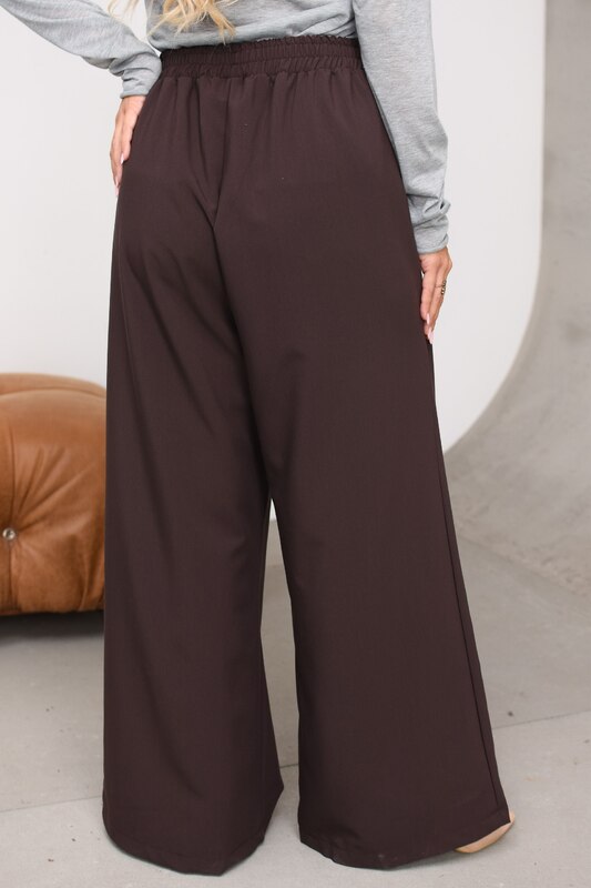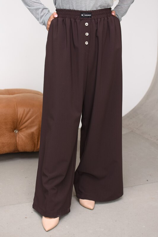 Эластичный пояс на резинке делает модель удобной и адаптивной по посадке, а широкие штанины дарят свободу движений и комфорт в течение всего дня. Дополнительный акцент создают декоративные пуговицы спереди, которые делают брюки более интересными визуально и добавляют им аккуратную стильную деталь. Наличие карманов делает модель еще более практичной и удобной в повседневной носке.