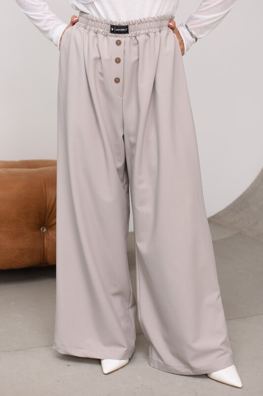 Высокая удобная посадка с эластичным поясом на резинке делает модель особенно комфортной. Брюки хорошо садятся по талии, не сковывают движения и дарят ощущение легкости при ходьбе. Широкий крой визуально удлиняет ноги и делает весь образ более гармоничным. Дополнительный акцент создают декоративные пуговицы спереди, которые придают модели аккуратную стильную деталь и делают ее более интересной, чем обычные базовые брюки. Карманы добавляют практичности и удобства в повседневной носке.