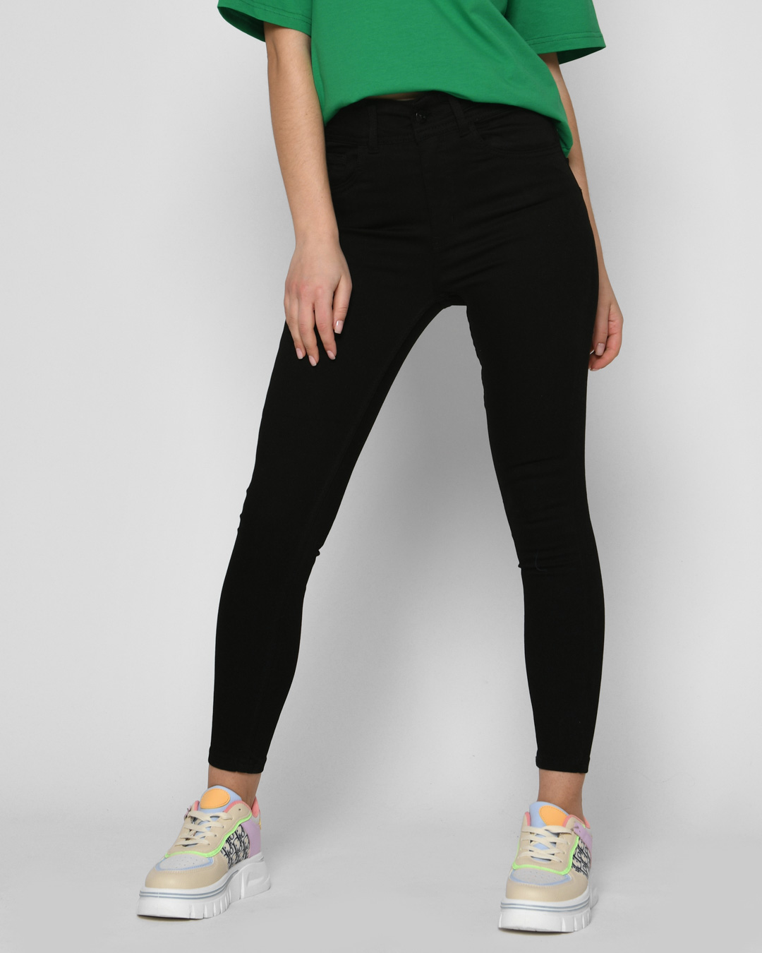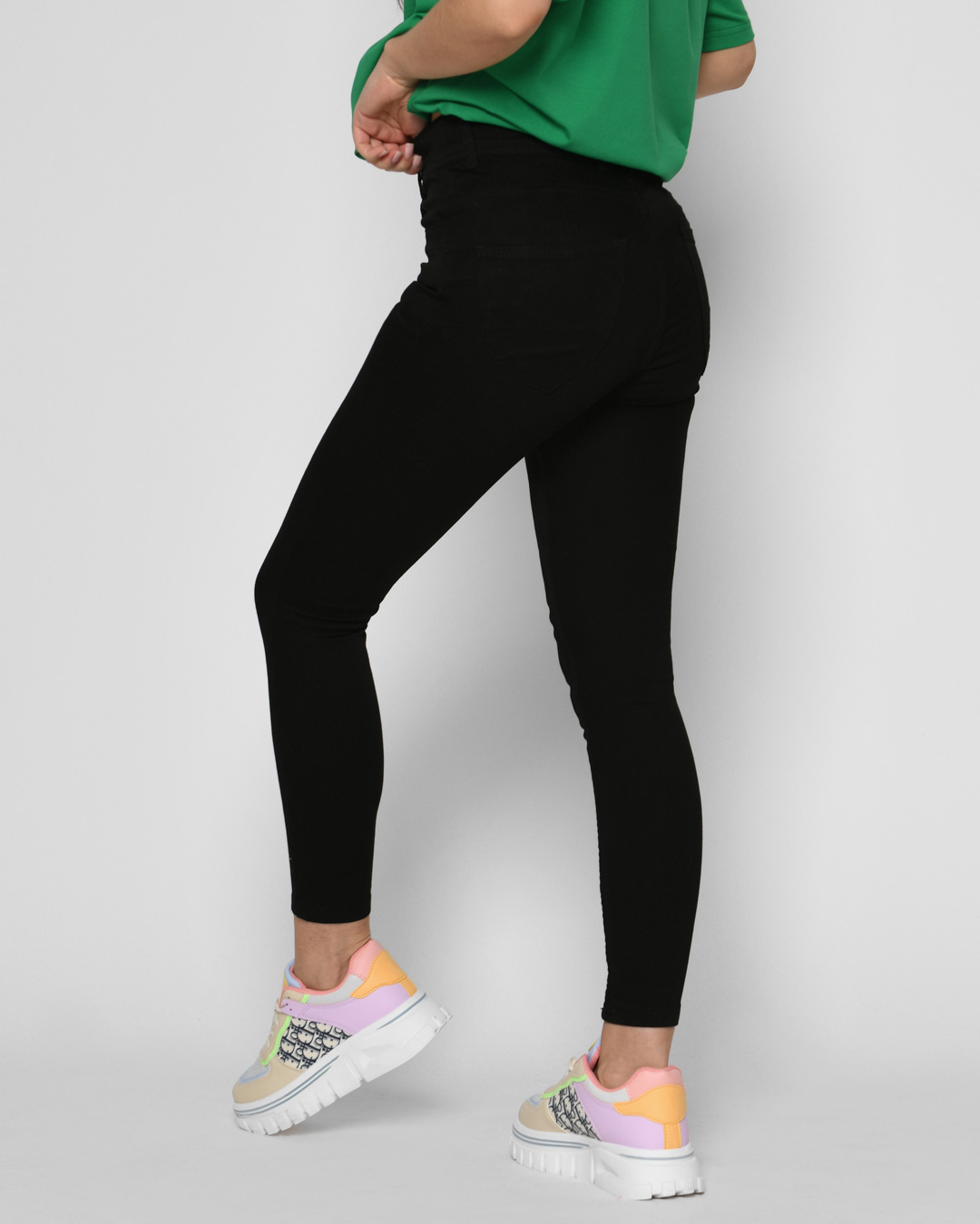 Черные джинсы скинни с высокой посадкой и зауженными штанинами, подчеркивающими фигуру. Модель содержит пять карманов: три спереди и два сзади. Застежка на молнии и пуговице добавляет удобства. Идеальный выбор как для выхода, так и для повседневной носки.