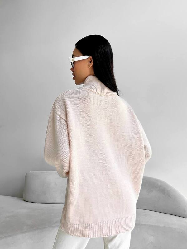 Свитер имеет свободный оверсайз-крой, который визуально делает фигуру более изящной и дарит ощущение лёгкости. Высокий воротник-гольф эффектно удлиняет шею и надёжно защищает от холода, а широкие манжеты и резинка по низу придают модели стильную завершённость. Благодаря нейтральному цвету и лаконичному дизайну свитер легко комбинируется с любыми элементами гардероба.