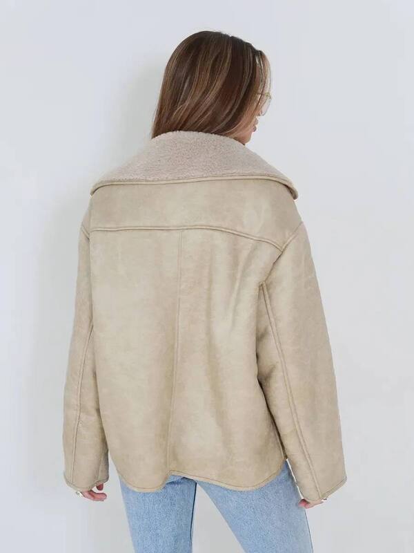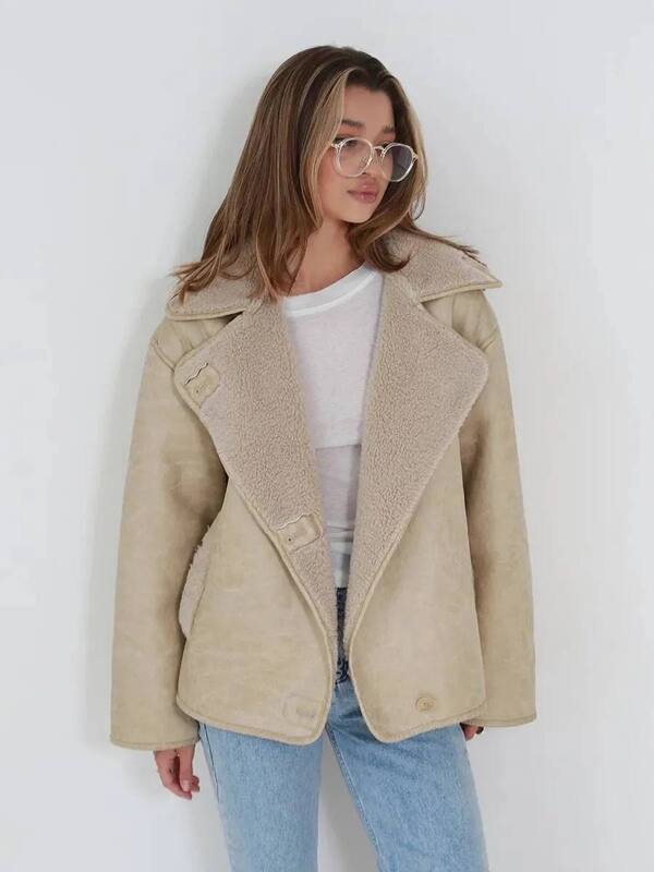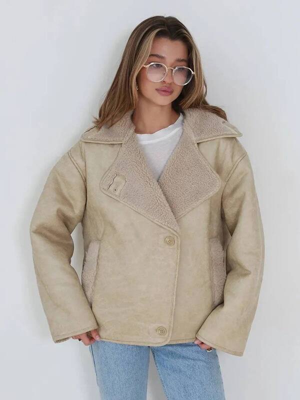Модель має модний вільний крій у стилі oversize, який не сковує рухів і дозволяє комбінувати її з об’ємними светрами чи худі. Великий комір із хутра створює приємне відчуття затишку, а декоративні ремінці додають образу індивідуальності та трендовості. Завдяки довжині до стегон дублянка підходить для створення різних образів — від повсякденних міських до більш елегантних. Вона однаково добре виглядає з джинсами, спідницями чи сукнями, надаючи образу шику й гармонії.