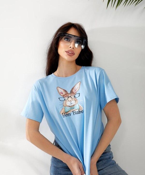 Главный акцент этой футболки — выразительный принт с зайцем в очках и надписью, который сразу привлекает внимание и делает модель более запоминающейся. Такой рисунок добавляет образу легкость, характер и модное настроение, благодаря чему даже самый простой комплект выглядит интереснее. Футболка отлично подойдет тем, кто любит удобные вещи с настроением и хочет добавить в гардероб что-то не только практичное, но и визуально привлекательное.