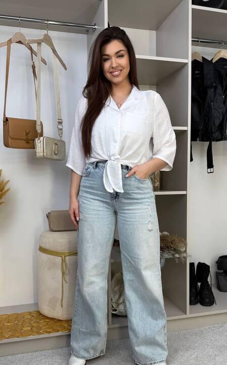 Модель выполнена с воротником и застёжкой на пуговицы, что делает её более интересной и визуально завершённой. Узел по низу добавляет образу лёгкость, непринуждённость и подчёркивает женственный характер вещи. Короткий свободный рукав делает блузу комфортной для тёплой погоды и позволяет легко сочетать её с джинсами, брюками, юбками и шортами. Такая вещь хорошо смотрится как в более расслабленных образах, так и в аккуратных повседневных сочетаниях.
