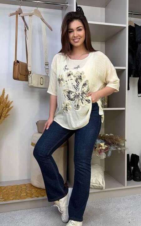 Декоративный рисунок на передней части делает модель более выразительной и добавляет образу интересный акцент. Такой декор смотрится заметно, но при этом не перегружает изделие, сохраняя универсальность и лёгкость сочетаний. Круглый вырез делает модель привычной и удобной, а свободный рукав дополняет общий расслабленный характер вещи. За счёт удачной длины футболку-тунику можно носить как с джинсами и брюками, так и с более облегающим низом, создавая гармоничные и удобные образы.
