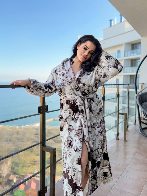 Такой халат станет прекрасным выбором для повседневного использования дома, отдыха после душа или ленивого утра за чашкой кофе. Благодаря качественному пошиву и устойчивому материалу он долго сохраняет форму и насыщенность рисунка, оставаясь мягким и привлекательным даже после частых стирок. Это изделие объединяет в себе уют, практичность и женственность в каждом элементе.