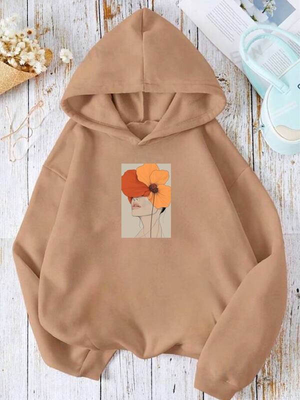 Фронтальный накат — яркий акцент, который делает худи уникальным. Изображение выполнено в стиле модной графики с женским профилем и крупными цветами, что создаёт эффектный и художественный вид. Такой принт добавляет образу индивидуальности, делает изделие выразительным и подчеркивает современный характер модели. Он хорошо вписывается в базовый бежевый тон ткани, создавая гармоничное и продуманное сочетание.