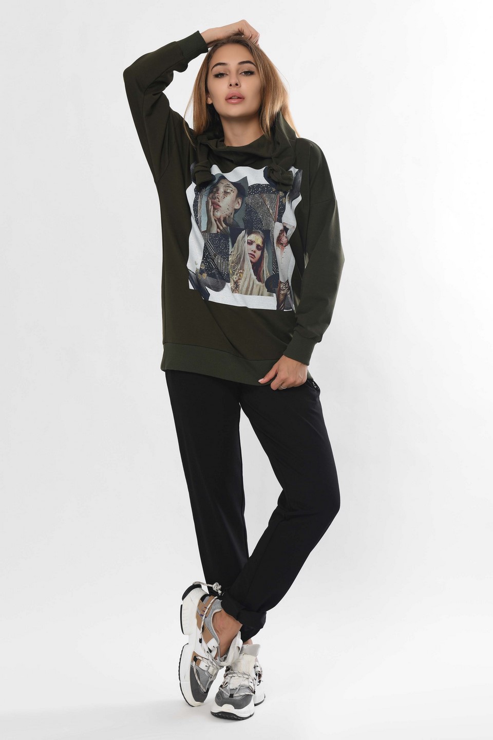 Доступные размеры :[S] Размер S:Рост модели:170 смДлина внешнего шва:98Длина внутреннего шва:76Длина изделия:70Длина плеча:25Длина рукава:41Обхват бедер:96Обхват груди:124Обхват талии:80Ширина плечей:66Этот женский спортивный костюм включает худи с к.. Читать полностью