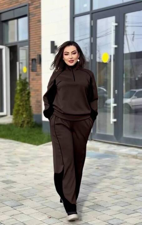 Трендовый комбинированный костюм-двойка из качественного велюра — это готовый образ, который выглядит современно и собранно, но носится с максимальным комфортом. Комплект сразу притягивает внимание за счёт контрастных вставок и вертикальных линий, которые визуально вытягивают силуэт, делают фигуру более стройной и добавляют образу динамику. Такой костюм отлично подходит для городского ритма: прогулки, дорога, встречи в формате casual, активные дела, когда важно выглядеть ухоженно без лишних усилий.