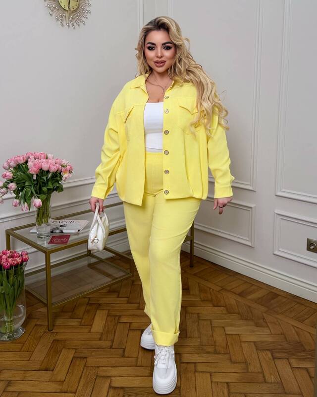 • Заміри по готовому виробу50–52• ОГ — 120 см• Рукав — 76 см• Довжина кофти — 67 см• ОТ — 110 см• ОС — 112 см• Довжина штанів — 105 см54–56• ОГ — 128 см• Рукав — 77 см• Довжина кофти — 68 см• ОТ — 116 см• ОС — 120 см• Довжина штанів — 106 см58–60• ОГ — 136 см• Рукав — 78 см• Довжина кофти — 69 см• ОТ — 122 см• ОС — 128 см• Довжина штанів — 107 см62–64• ОГ — 144 см• Рукав — 79 см• Довжина кофти — 70 см• ОТ — 128 см• ОС — 134 см• Довжина штанів — 108 смЗаміри зроблені по готовому виробу, можливе відхилення 1–2 см.