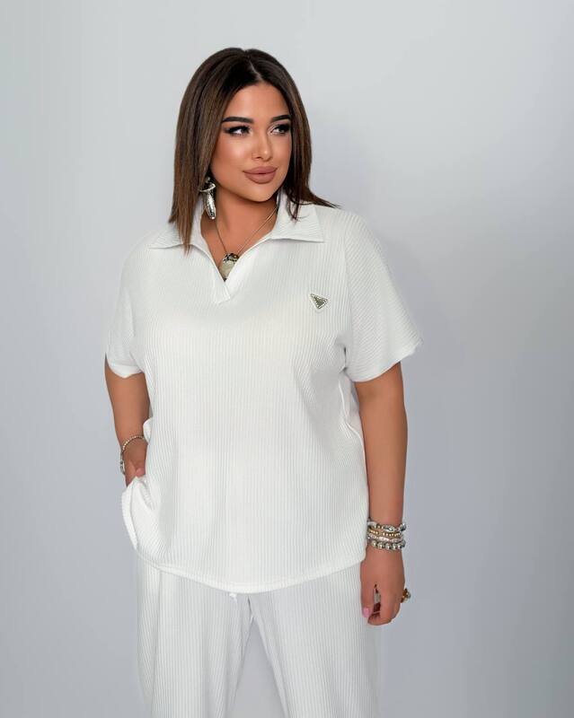 Верх выполнен в формате свободной футболки с аккуратным отложным воротником и коротким рукавом. За счет такого фасона модель выглядит более собранно и интересно, чем классическая базовая футболка, но при этом остается такой же удобной и универсальной. Свободная посадка не сковывает движения, красиво ложится по фигуре и помогает чувствовать себя комфортно в течение всего дня. Лаконичный дизайн делает верх легким для сочетания с разной обувью, аксессуарами и верхней одеждой, а сам комплект приобретает стильный и современный характер.