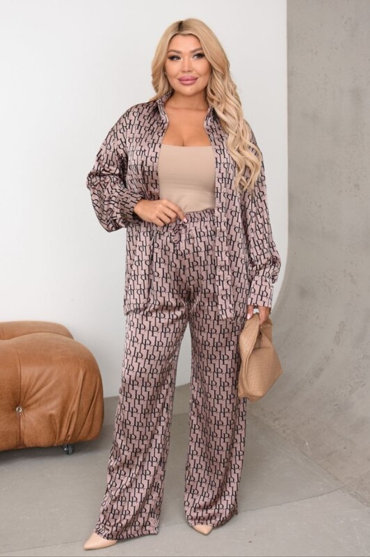 Этот женский костюм-двойка сразу привлекает внимание эффектным принтом, красивой посадкой и тем удачным сочетанием комфорта и выразительности, которое делает образ по-настоящему запоминающимся. Комплект выглядит современно, стильно и уверенно, при этом остается удобным в носке и не требует сложной стилизации. Свободная рубашка на пуговицах придает образу легкость и расслабленную элегантность, а широкие брюки палаццо создают вытянутый силуэт, который смотрится гармонично, женственно и очень актуально.
