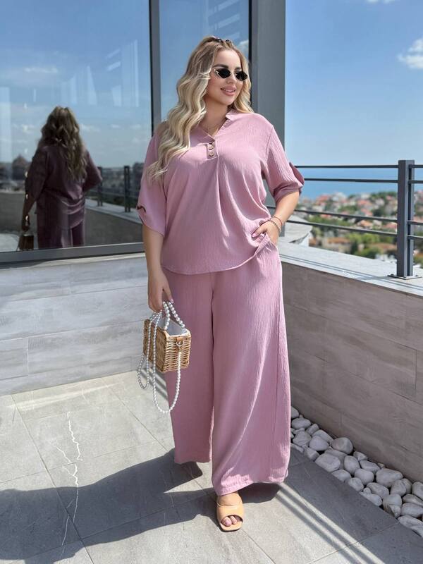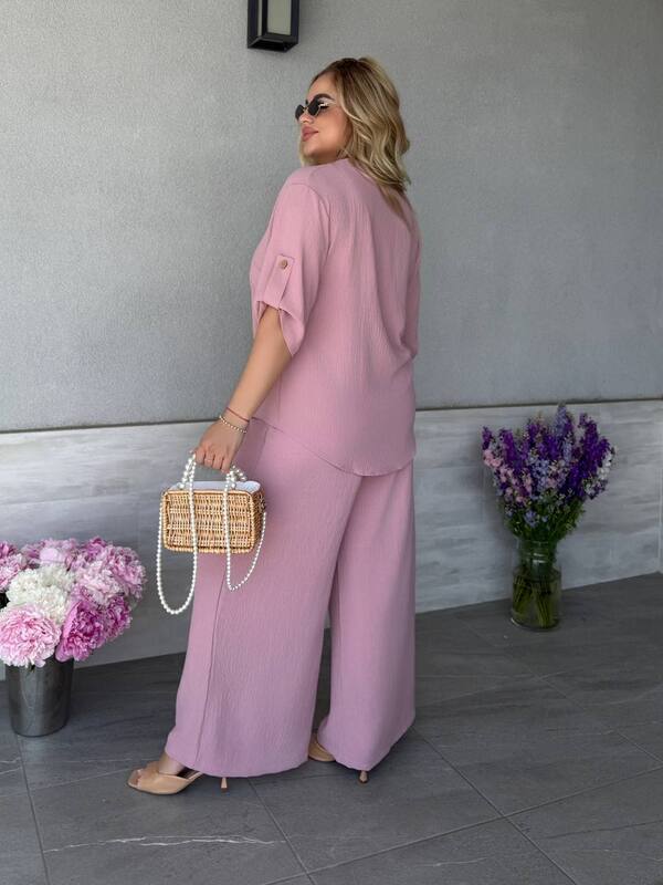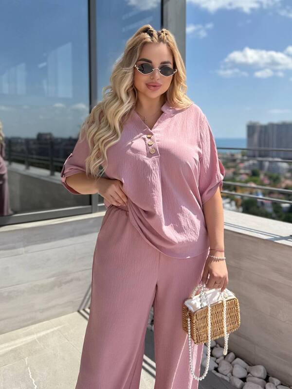 Верх выполнен в свободной посадке, красиво ложится по фигуре и не сковывает движения. Мягкая линия выреза делает образ более женственным и визуально облегчает силуэт, а аккуратная декоративная планка добавляет модели выразительности и делает ее интереснее без лишней вычурности. Рукава комфортной длины смотрятся аккуратно и придают комплекту завершенный вид. Брюки широкого кроя красиво струятся при движении, визуально вытягивают силуэт и делают весь образ более элегантным и уверенным.