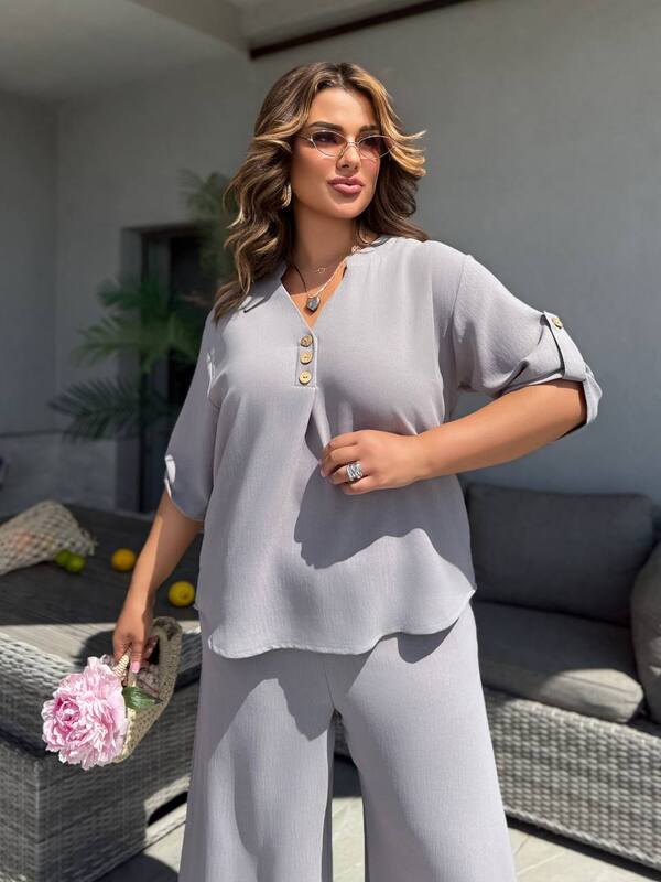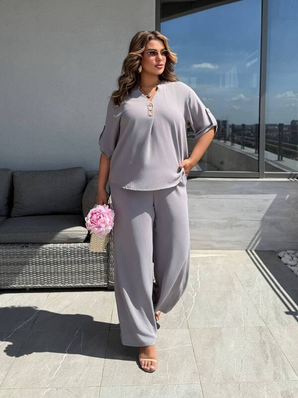 Свободная блуза красиво ложится по фигуре, не обтягивает и дарит комфорт в течение всего дня. Мягкая линия выреза делает верх женственным и визуально облегчает образ, а рукава добавляют модели аккуратности и выразительности. Брюки с широким кроем смотрятся современно, визуально вытягивают силуэт и делают посадку особенно удобной. Комплект выглядит гармонично, расслабленно и при этом достаточно собранно, чтобы его можно было носить не только на прогулку, но и на встречи, в поездки, на работу или в гости.
