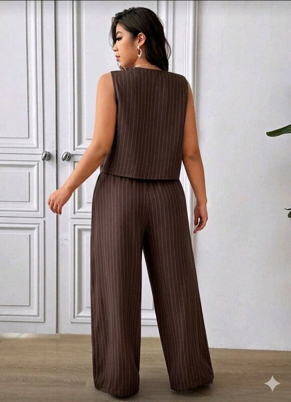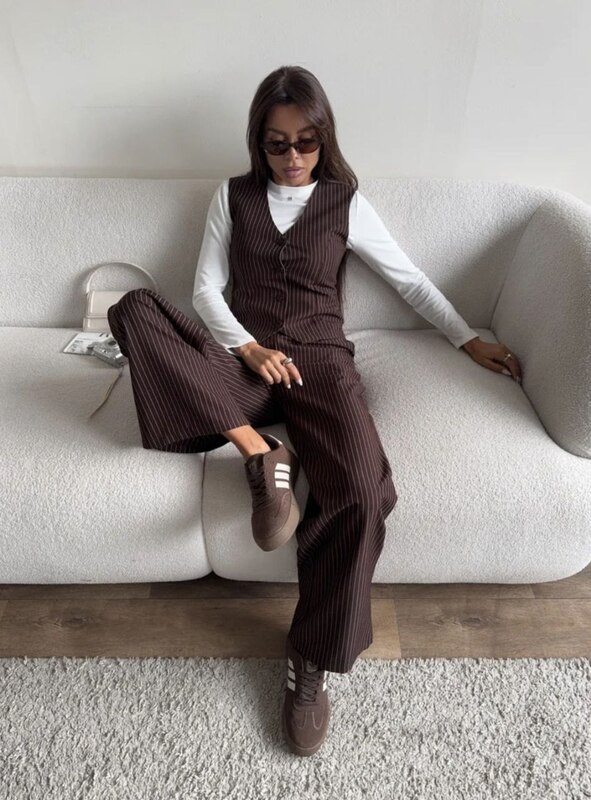 Жилетка делает образ более четким и структурным, красиво подчеркивает верхнюю часть силуэта и добавляет комплекту стильную строгость. V-образный вырез визуально вытягивает линию шеи и делает посадку более изящной, а застежка на пуговицы придает модели аккуратный и завершенный вид. Вертикальный рисунок смотрится благородно, визуально стройнит и делает весь комплект более выразительным. Благодаря такому крою жилетка выглядит женственно, современно и легко вписывается не только в готовый комплект, но и в другие образы гардероба.