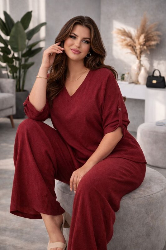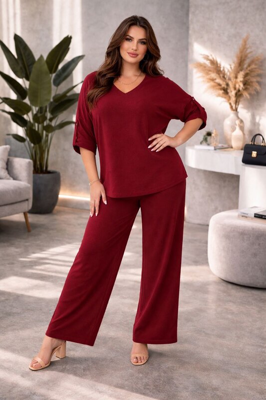 Верх выполнен в свободном крое с мягкой посадкой, благодаря чему костюм красиво ложится по фигуре, не обтягивает и не сковывает движения. V-образный вырез визуально вытягивает линию шеи, делает образ легче и изящнее, а также добавляет женственности и аккуратной элегантности. Рукава свободные, комфортные, с декоративной фиксацией, что делает модель более интересной и завершенной. Такой верх хорошо смотрится не только в комплекте, но и отдельно с джинсами, классическими брюками или юбкой.
