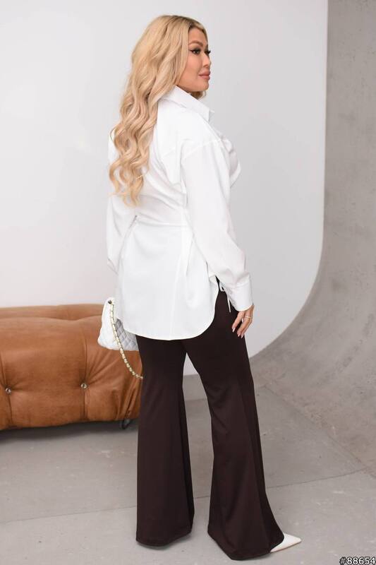 Блуза имеет удлиненный силуэт, классический воротник и застежку по центру, что делает модель универсальной и визуально собранной. Особое внимание привлекают завязки по бокам: они помогают красиво подчеркнуть линию талии, добавляют образу женственности и делают посадку более выразительной. Длинные рукава с мягким объемом выглядят эффектно и при этом остаются удобными для повседневной носки.