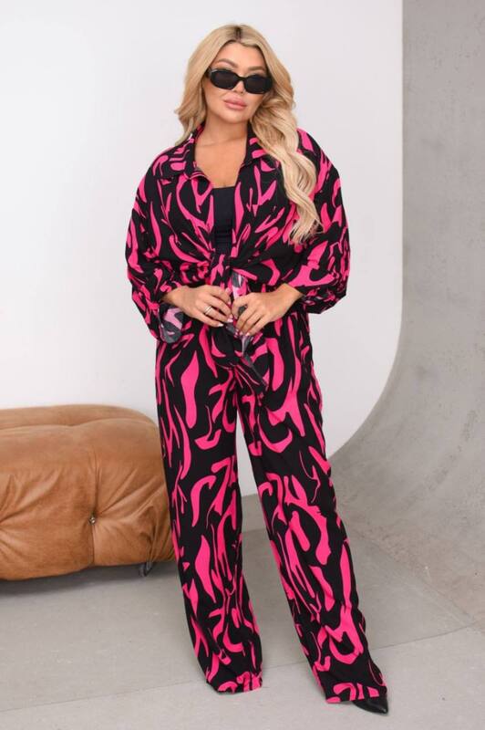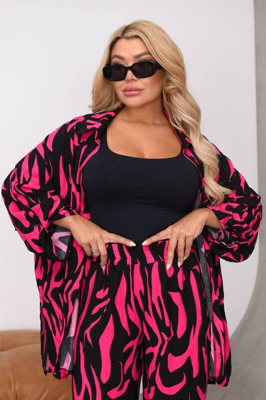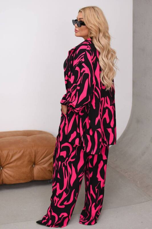 Комплект состоит из свободной блузы и широких брюк. Блуза имеет удлиненный фасон, отложной воротник, застежку по центру и рукав удобной длины, что делает изделие практичным и универсальным. Ее можно носить застегнутой как самостоятельный верх или расстегнутой поверх топа, майки либо футболки, создавая более расслабленный многослойный образ.