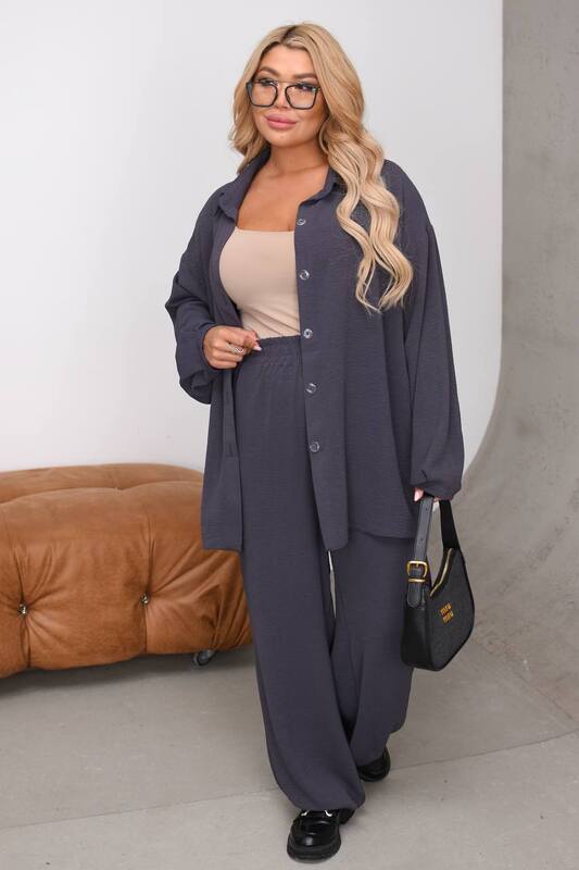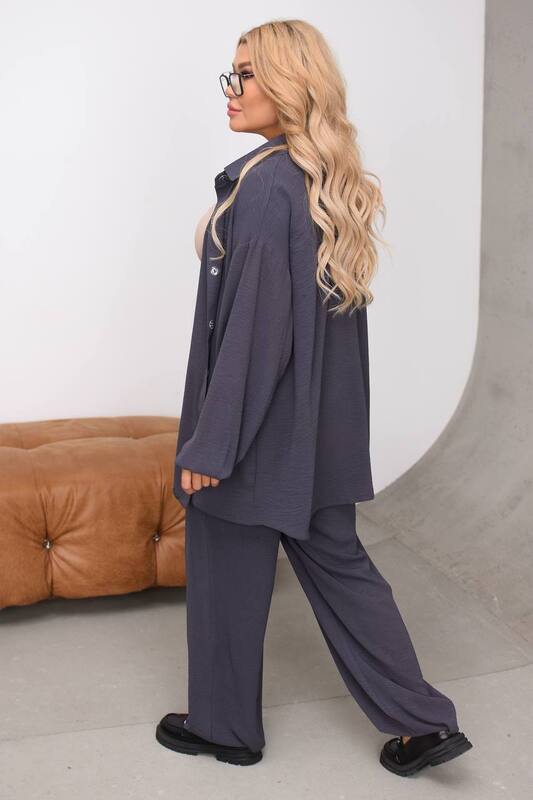 Брюки свободного силуэта отлично дополняют рубашку и создают гармоничный комплект. Пояс на резинке удобно садится по талии, не давит и адаптируется к фигуре, что особенно важно для длительной носки в течение дня. Свободный крой по ноге дарит ощущение легкости, не обтягивает и визуально делает образ более плавным. Длина брюк позволяет сочетать костюм как с обувью на низком ходу, так и с более женственными моделями.