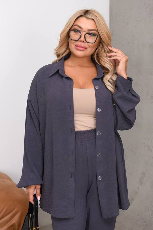 Верх выполнен в формате удлиненной рубашки свободного кроя. Такая посадка не сковывает движения, мягко ложится по фигуре и помогает создать расслабленный, но при этом ухоженный силуэт. Отложной воротник добавляет образу аккуратности, а застежка на пуговицы делает модель практичной и универсальной. Рубашку можно носить застегнутой как самостоятельный верх, расстегнутой поверх топа или майки, а также комбинировать отдельно с джинсами, юбками, леггинсами или другими брюками. Удлиненная линия изделия красиво прикрывает бедра и делает посадку более комфортной для разных типов фигуры.