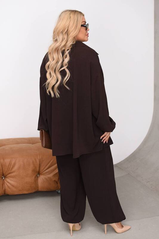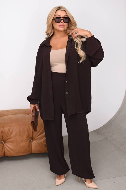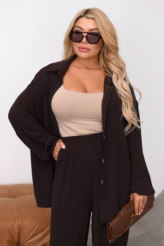 Рубашка выполнена в свободном крое с комфортной посадкой по фигуре. Она не облегает, не сковывает движения и красиво ложится по силуэту, создавая легкий эффект оверсайз. Удлиненная линия изделия аккуратно прикрывает бедра, помогает визуально вытянуть силуэт и делает комплект особенно удобным для разных типов фигуры. Отложной воротник добавляет образу собранности, а застежка на пуговицы позволяет носить верх несколькими способами: застегнутым, частично расстегнутым или как легкий верхний слой поверх майки, топа либо футболки. Длинный рукав поддерживает расслабленный стиль и при желании может быть слегка подвернут для более непринужденного образа.