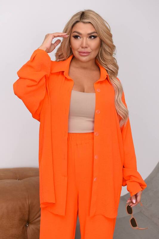 Рубашка выполнена в свободной посадке с легким эффектом оверсайз. Она не обтягивает фигуру, мягко ложится по силуэту и создает комфортное ощущение в носке. Удлиненная линия изделия прикрывает зону бедер, визуально вытягивает силуэт и делает модель удобной для разных типов фигуры. Отложной воротник добавляет комплекту аккуратности, а застежка на пуговицы позволяет носить рубашку по-разному: застегнутой, частично расстегнутой или как легкий верхний слой поверх топа, майки либо футболки. Длинный рукав поддерживает расслабленный стиль, а при желании его можно слегка подвернуть для более непринужденного образа.