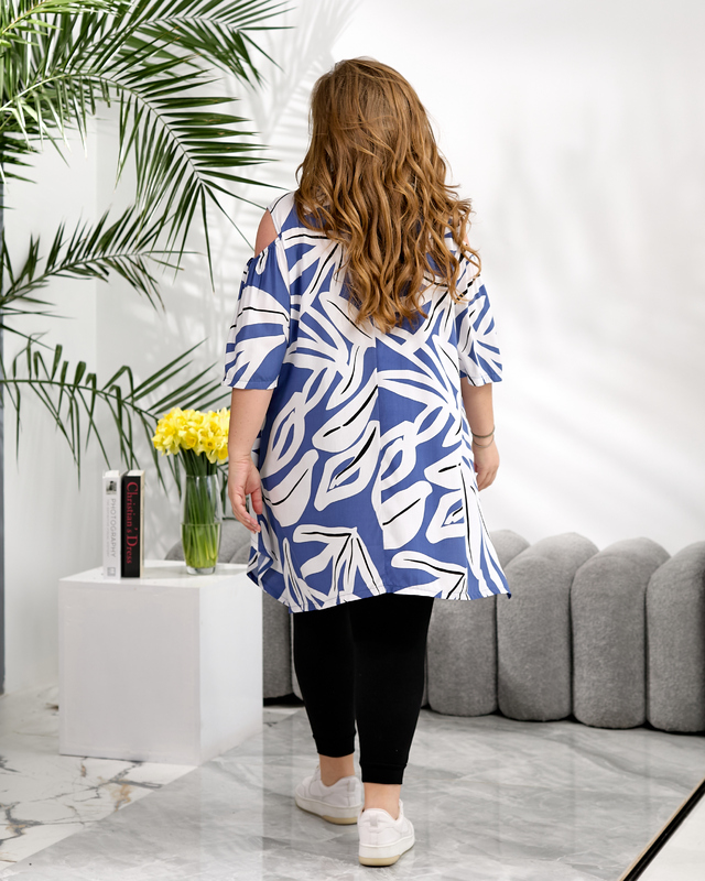 Удлиненная футболка смотрится эффектно за счет свободного кроя, асимметричного низа и крупного абстрактного принта. Открытые плечи добавляют образу легкости и делают модель более современной и заметной. Такой верх не выглядит скучно и не требует сложных сочетаний, потому что сам по себе создает готовый стильный образ. Дополнительный плюс — удобные карманы, которые делают модель еще более функциональной.