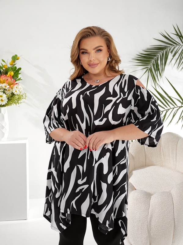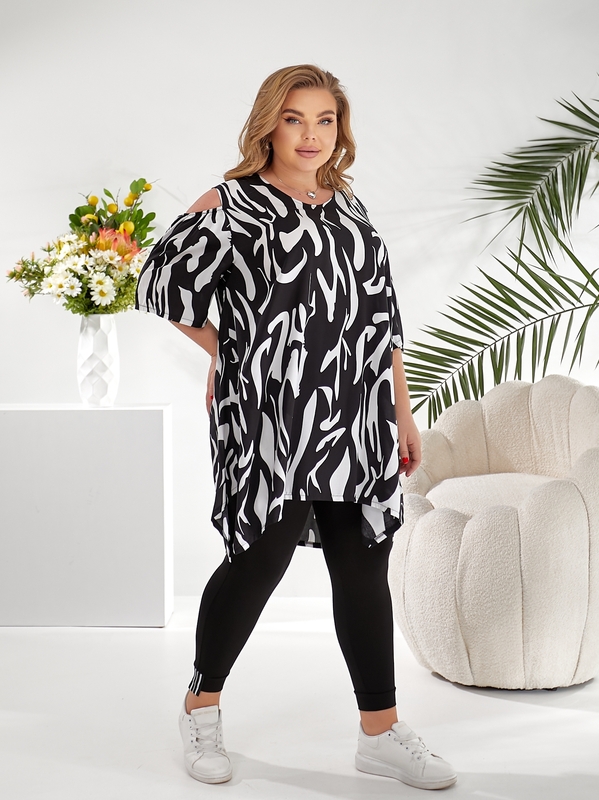 Туника выполнена в свободном крое с мягкой линией плеча, рукавом длиной три четверти и асимметричным низом, который делает образ более интересным и визуально вытягивает силуэт. Абстрактный принт добавляет модели выразительности и помогает комплекту смотреться не банально, а собранно и современно. Лосины из очень эластичной вискозы хорошо тянутся, комфортно садятся по фигуре и не сковывают движения.