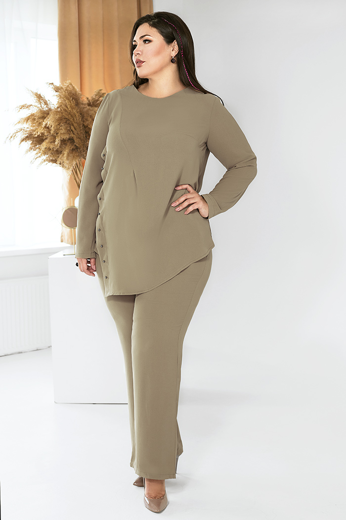 Костюм-двойка женский из крепа с асимметричной блузой и расклешенными брюками летне-осенний M-1027-PL4-495-30