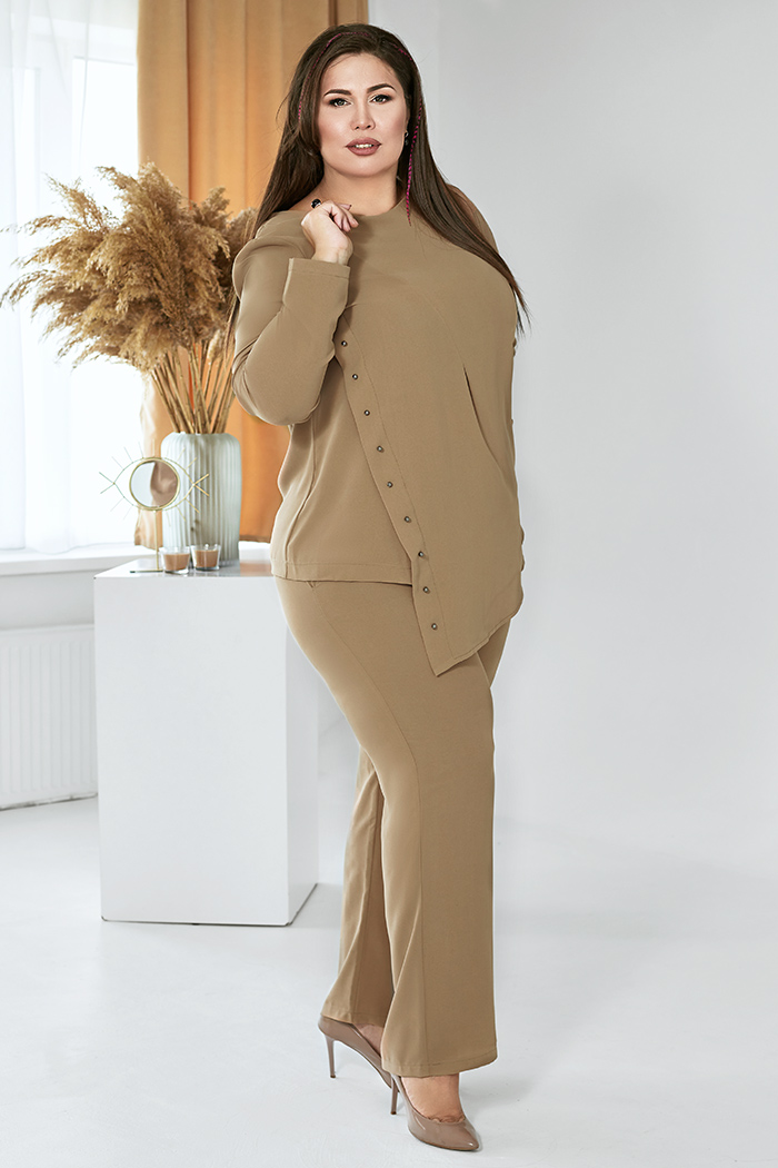 Плательный креп хорошо держит форму, красиво струится и помогает изделию выглядеть аккуратно и достойно. За счет состава с полиэстером и вискозой ткань сочетает практичность, комфорт и привлекательный внешний вид. Такой костюм можно носить как готовым комплектом, так и сочетать его элементы отдельно с другими вещами гардероба. Это удачный выбор для женщины, которая хочет получить универсальный, современный и действительно носибельный комплект, способный выручить во множестве ситуаций.