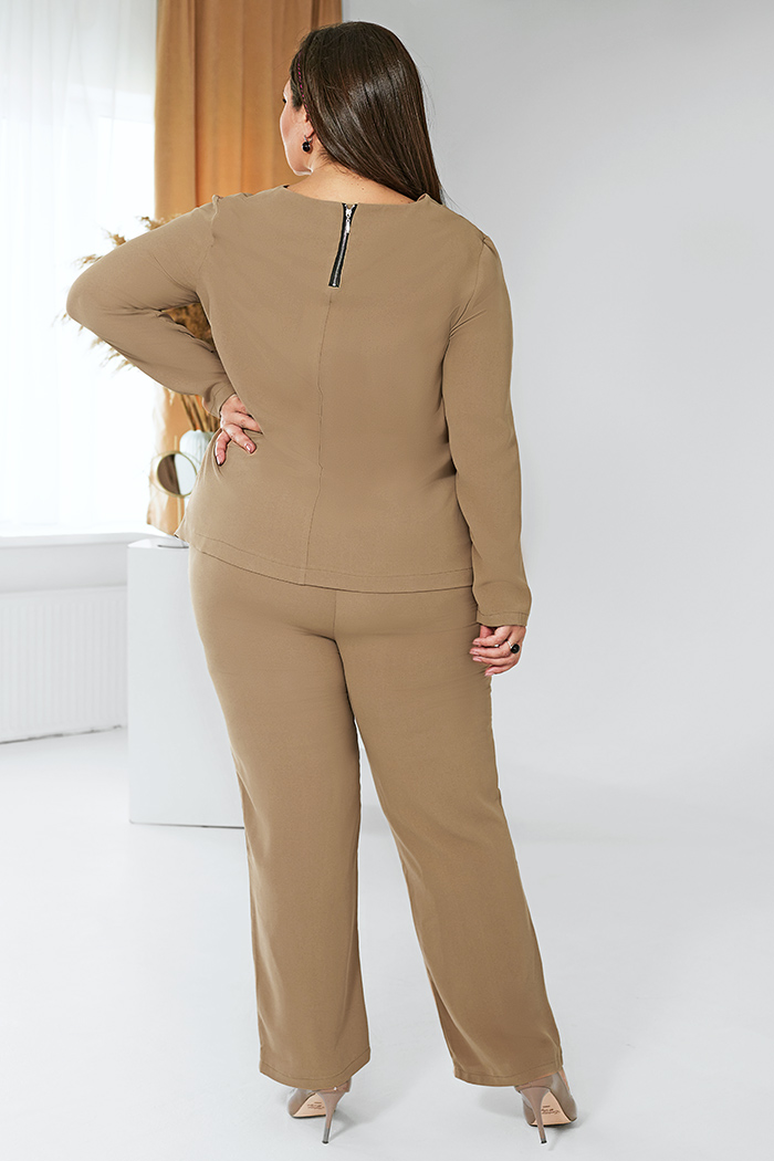 Брюки расклешенного силуэта делают комплект особенно элегантным. Такой фасон визуально удлиняет ноги и придает образу более вытянутый, гармоничный вид. Спереди расположен гульфик, который делает модель аккуратной и более собранной, а боковые карманы добавляют практичности на каждый день. Пояс на резинке по спинке обеспечивает комфортную посадку, позволяет брюкам удобно садиться по фигуре и делает их приятными в носке в течение дня. В результате комплект не только красиво выглядит, но и действительно удобен в повседневном использовании.