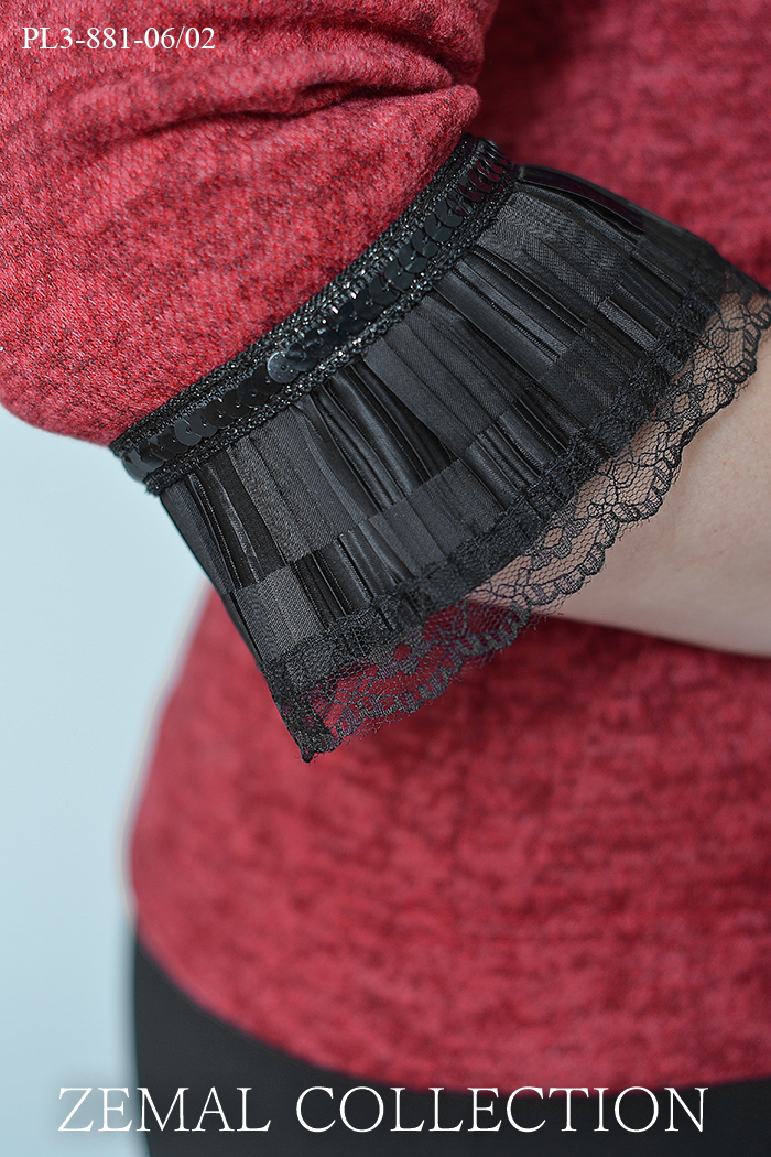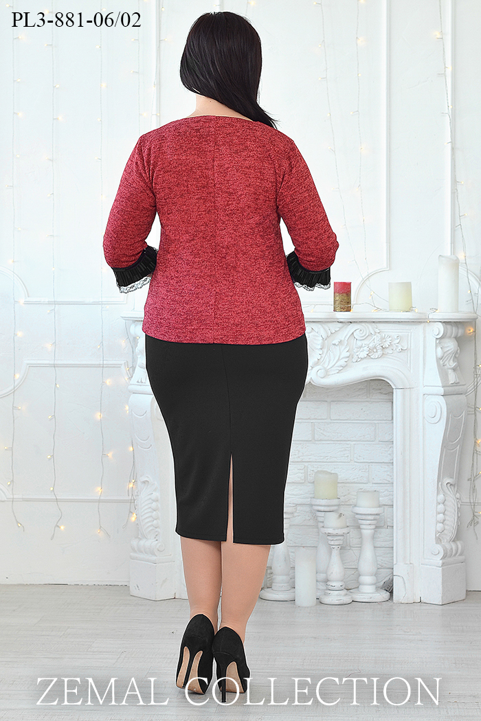 Трикотажный костюм, состоящий из джемпера и юбки Джемпер полуприлегающего силуэта с рукавом ¾. Низ рукавов заканчивается кружевным воланом Юбка «карандаш» – на резинке . Длина юбки – ниже колен