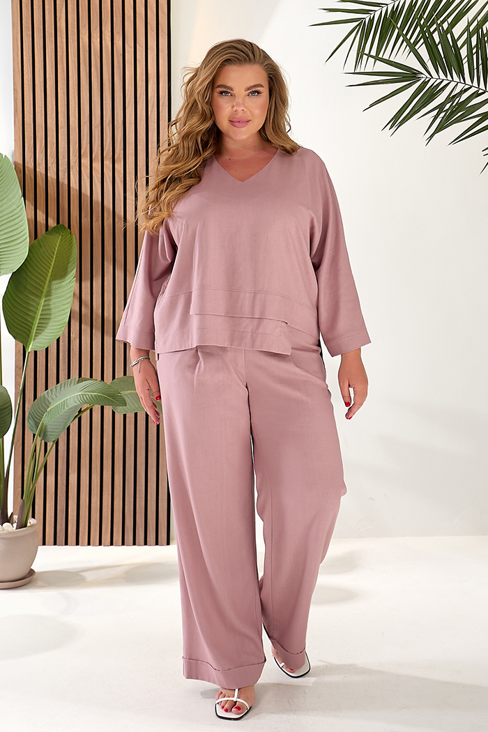 Доступные размеры :[52, 54, 56, 60, 62] Костюм, що складається з штанів та блузи. Блуза прямого силуету, рукав цілісний, довжина ¾. Перед з геометричними фасонними підрізами. Виріз горловини V – образний. Штани прямі. Кишені з відрізним бочком. Засті.. Читать полностью