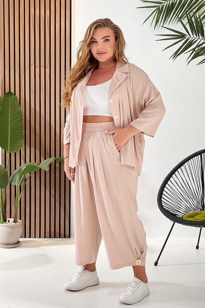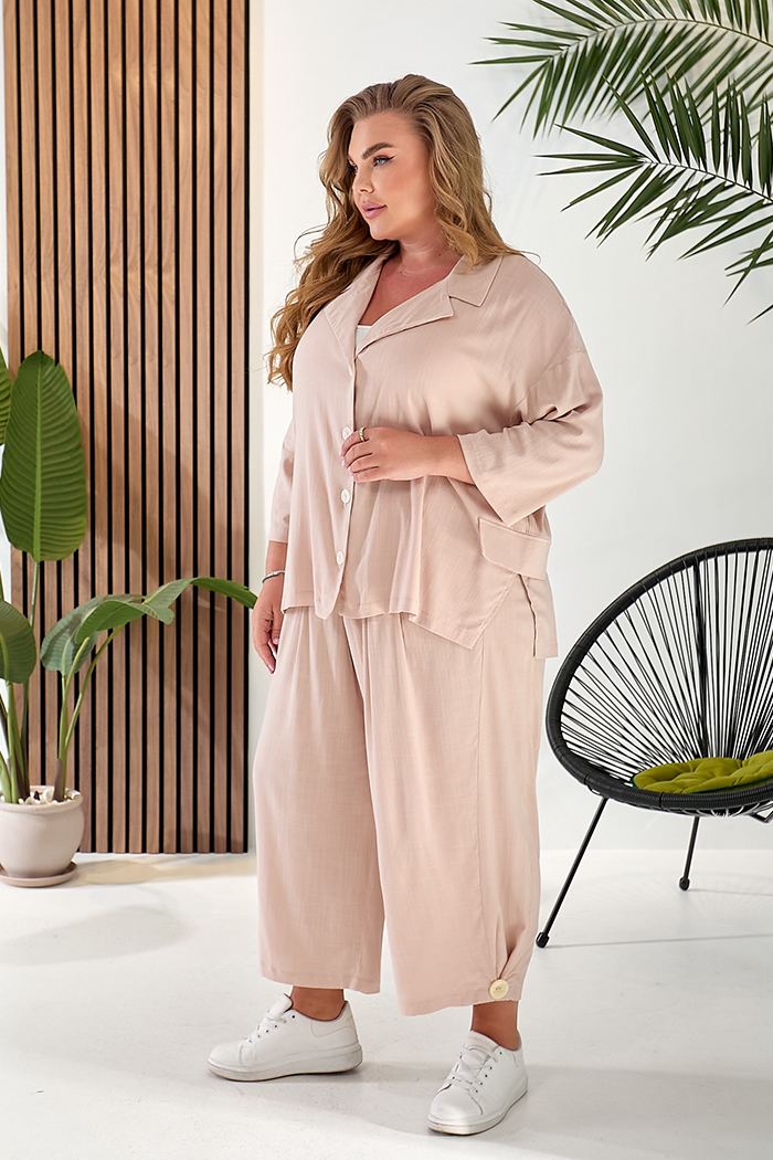 Доступные размеры :[52, 54, 56, 58] Костюм складається з жакету та штанів. Жакет вільного крою із застібкою на гудзики. Оздоблювальні клапани на поличках. Комір з лацканом. Рукав 3/4. У бічних швах розрізи. Штани прямого крою, широкі. На передніх пол.. Читать полностью