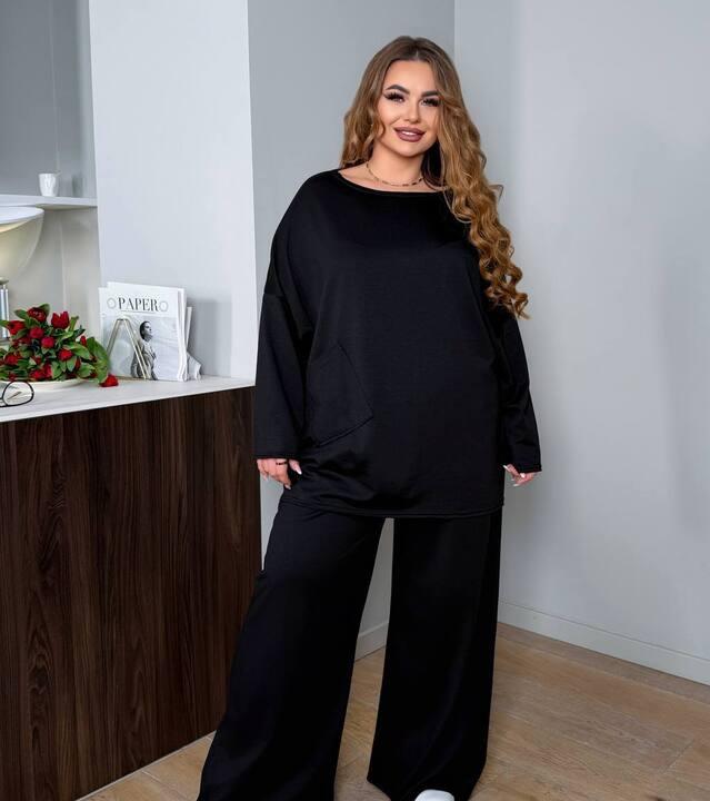 Брюки — широкого прямого кроя в стиле палаццо: они вытягивают силуэт, добавляют образу лёгкость и красиво смотрятся как с кроссовками, так и с более аккуратной обувью. Посадка комфортная для длительной носки, линия талии подчёркивается мягко, без давления, а свободные штанины создают эффект дорогого спокойного минимализма. Комплект отлично работает как самостоятельный образ, но при желании вещи можно носить отдельно: свитшот — с джинсами или юбкой, а брюки — с футболкой, лонгсливом или рубашкой.