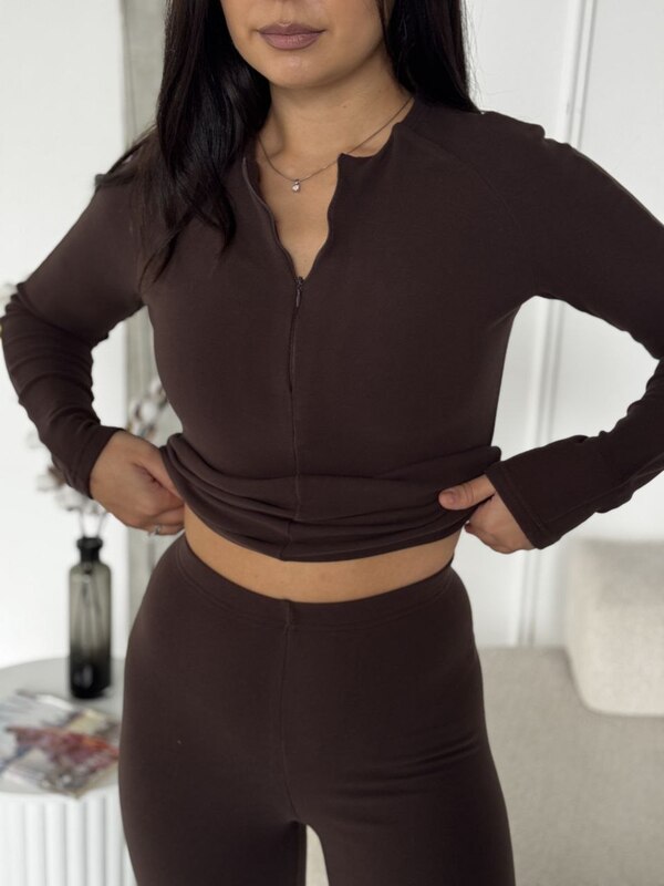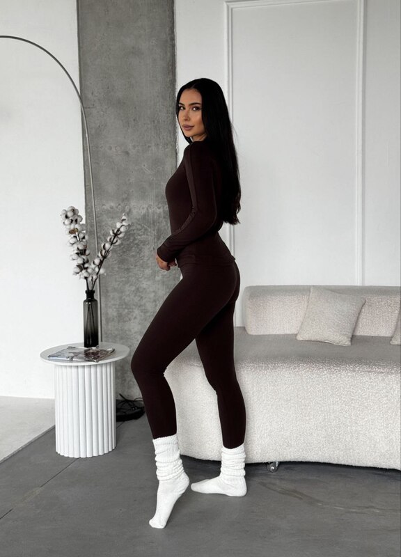 Комплект складається з обтислої кофти з довгими рукавами та застібкою-блискавкою, що додає зручності та дозволяє варіювати стиль — від спортивного до повсякденного. Легінси з високою посадкою підкреслюють фігуру, забезпечують підтримку і комфорт під час руху. Завдяки універсальному дизайну цей костюм можна носити окремо або використовувати як термошар під верхній одяг.