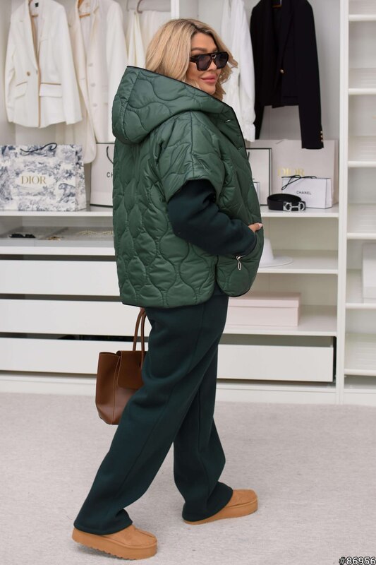 Главный акцент модели — стеганый жилет с выразительным фактурным рисунком. Он визуально собирает образ, добавляет ему объем и делает комплект более «дорогим» на вид. Жилет застегивается на пуговицы, поэтому удобно регулируется по посадке, а функциональные карманы на молнии помогают держать под рукой телефон, ключи и мелочи, не утяжеляя силуэт. Ворот и линия плеч смотрятся аккуратно, а капюшон добавляет практичности и защищенности в ветреную погоду.