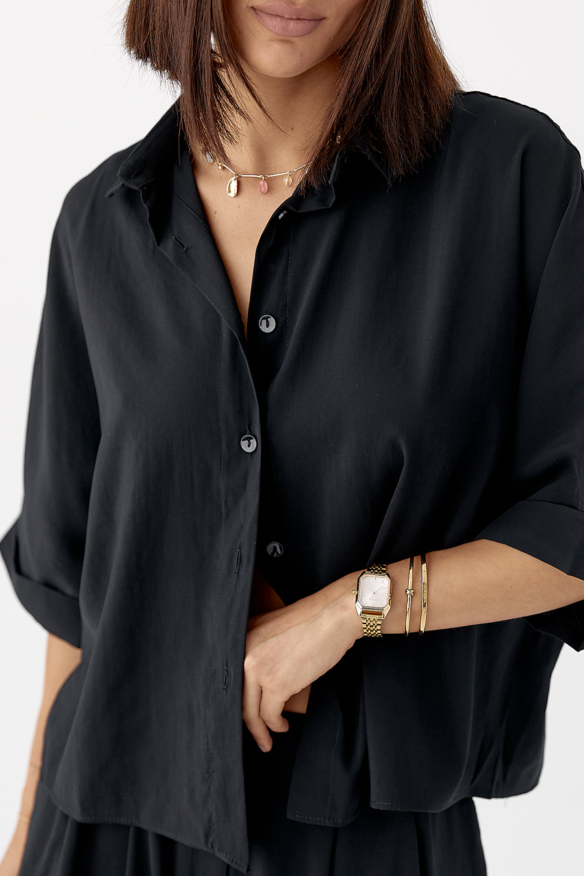 Сорочка вкорочена, з прямим низом і підкоченими рукавами, застібається на ґудзики, створюючи легкий та невимушений образ. Її лаконічний дизайн дозволяє носити як окремо, так і в комплекті.