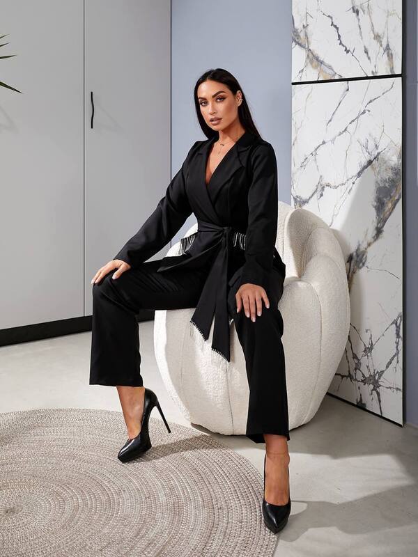 Женский костюм из костюмной ткани — это утончённое сочетание классики и современного стиля, которое создаёт эффектный и женственный силуэт. Комплект состоит из жакета-кимоно и брюк свободного кроя. Жакет завязывается поясом, позволяя подчеркнуть талию и скорректировать фигуру, а оригинальный декор бахромой добавляет нотку изысканности и модного акцента.