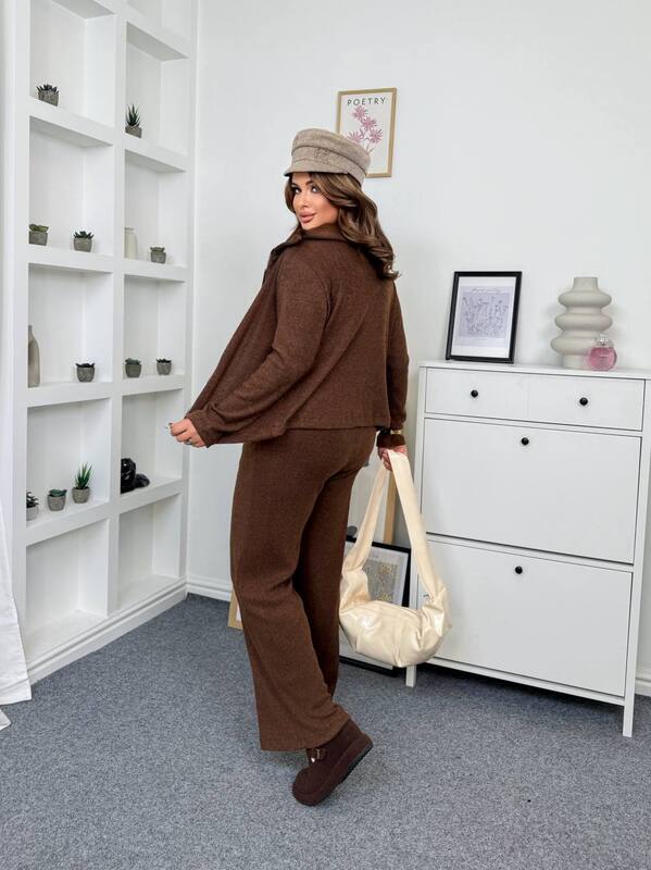 Такой костюм прекрасно подойдёт для осенне-зимнего сезона: его можно носить как дома, так и на прогулке, в поездке или неформальной встрече. Универсальный крой, уютная ангора и глубокий коричневый оттенок делают этот образ утончённым, стильным и практичным на каждый день.
