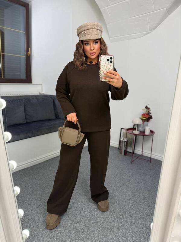 Кофта має вільний прямий крій з рукавом реглан, що забезпечує комфорт у русі та гарно лягає на будь-який тип фігури. Вона виглядає лаконічно, але водночас стильно, завдяки мінімалістичному дизайну. Брюки на еластичній резинці з двома кишенями — зручні та практичні. Вільний фасон надає легкості силуету, а висока посадка візуально подовжує ноги. Разом вони створюють гармонійний ансамбль, у якому комфорт і жіночність ідеально поєднуються.