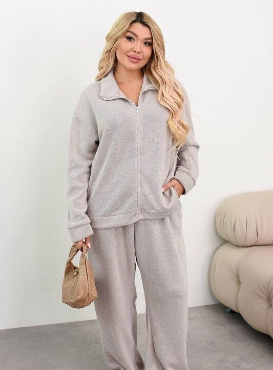 Верх костюма — зручна кофта на блискавці з довгим рукавом і акуратним коміром, що створює відчуття затишку та додає образу універсальності. Завдяки прямому силуету та м’яким лініям кофта легко комбінується з іншими елементами гардероба, зберігаючи естетику мінімалізму та легкості.