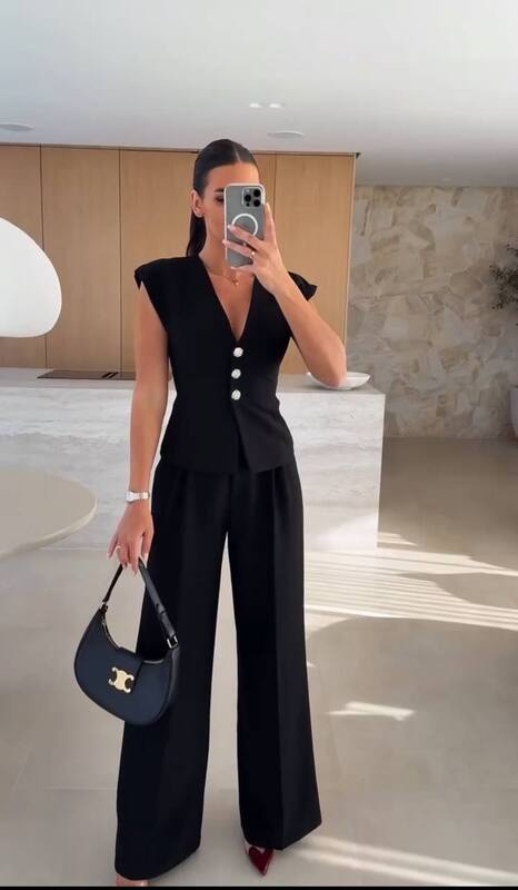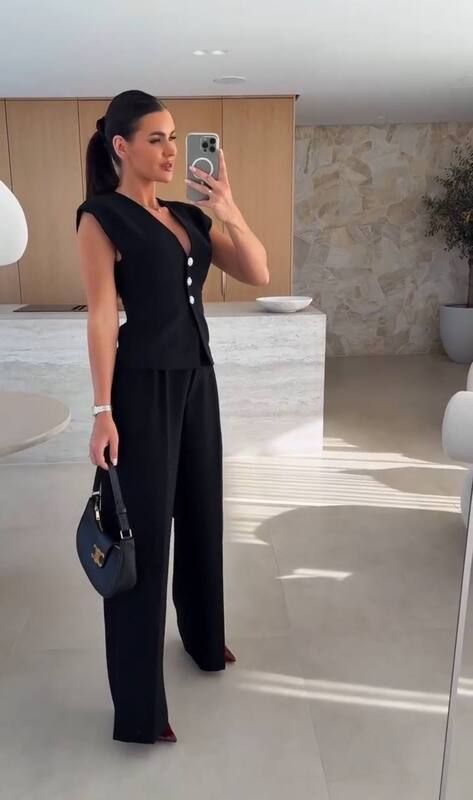 Жилет выполнен в выразительном жакетном стиле: глубокий V-образный вырез красиво подчёркивает линию шеи и зоны декольте, а ряд аккуратных пуговиц добавляет классическую ноту. Плечевая линия выглядит структурно и современно, благодаря чему верх держит форму и смотрится строго, но женственно. Посадка приталенная, с мягким расширением по линии талии, что помогает подчеркнуть фигуру и делает комплект особенно эффектным на фото и в реальной жизни.