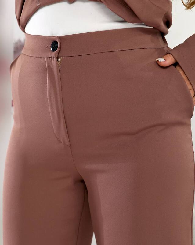 Костюм легко комбинируется с различными элементами гардероба. С классической блузой или рубашкой он создаст строгий деловой образ, с топом или футболкой — более расслабленный и современный. Подходит для работы, встреч, официальных мероприятий и даже для повседневного выхода, если дополнить его стильными аксессуарами. Нейтральный оттенок делает его актуальным и универсальным.