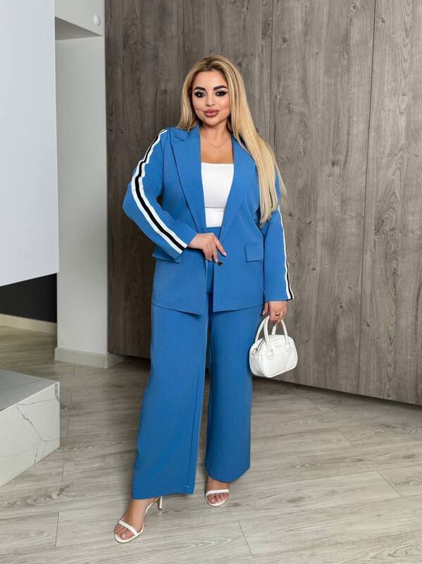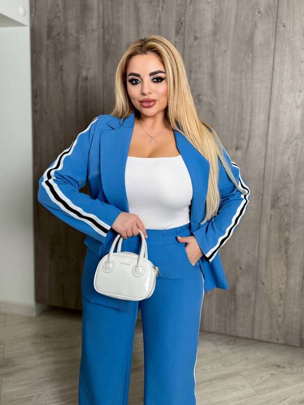 Женский костюм из ткани тиар с лампасами — это стильный и современный выбор для осеннего гардероба, который сочетает в себе элегантность и спортивный акцент. Плотная ткань тиар отличается прочностью и износостойкостью, она хорошо держит форму и при этом комфортна в носке, позволяя создавать практичные и удобные образы для любого случая. Пришивные лампасы на рукавах и брюках подчеркивают динамичность модели, делая ее модной и выразительной.