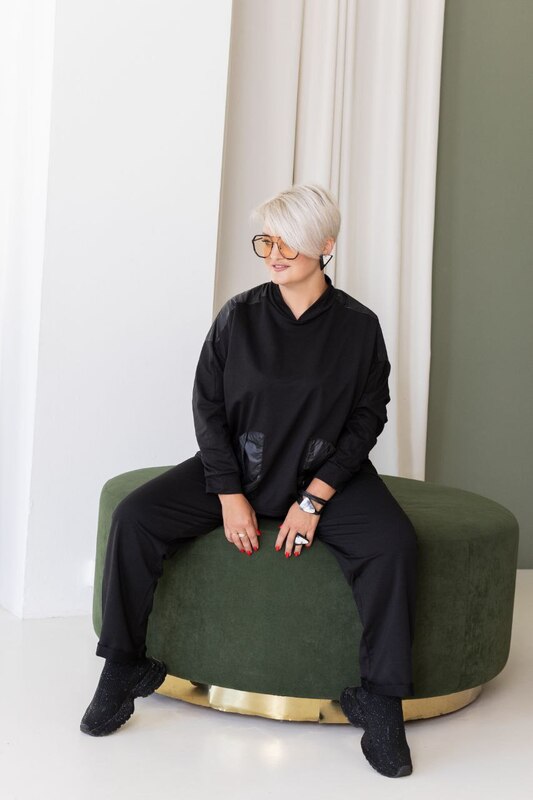 Женский костюм в чёрном цвете — стильное решение для повседневных образов. Модель выполнена из мягкой двунитки в сочетании с плащевкой, что делает её удобной и практичной. Свободный крой обеспечивает комфорт в движении и позволяет скрыть особенности фигуры.
